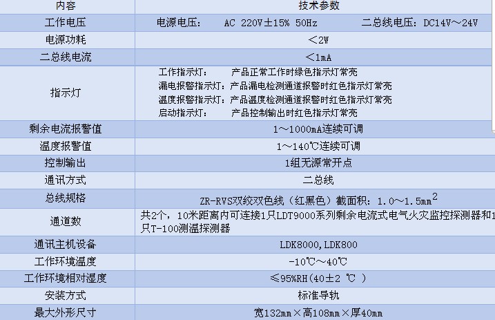 一、LDK800电气火灾监控设备功能 采用双总线回路,地址点数为100点。 采用中文液晶显示,并配发光二极管指示系统关键状态信息,可方便快捷地显示系统信息及系统工作状态。 具有黑匣子功能,能存贮999条报警记录。 支持分支、单支、树型分支多种布线方式。 具有1路无源报警信号输出端子和1路无源故障信号输出端子。 具有回路短路保护功能。 二、LDK800电气火灾监控设备技术参数
